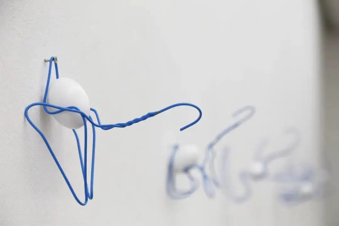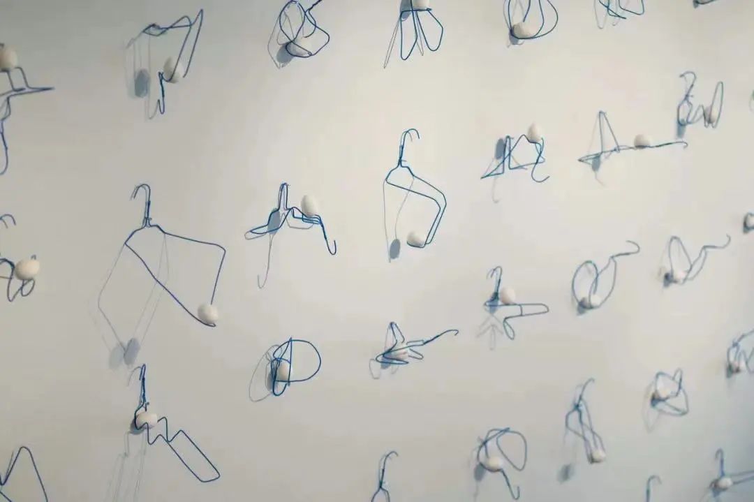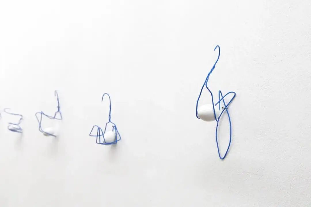 《命悬一线》是衣架和鸡蛋的50个组合的作品。在本来仅仅只能挂衣服的衣架上承载鸡蛋,有意识得重复悬挂与被悬挂这个随意的动作。衣架和鸡蛋作为日常生活的象征,有着自己的韵律和规则性,仿佛是可以将远离日常的东西拉回现实的存在,能使唤醒我们对日常生活中无意识的行为的思考。