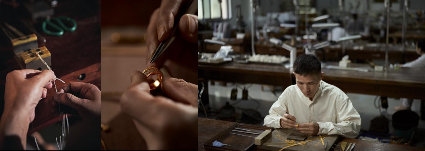 非遗花丝镶嵌,是“花丝”和“镶嵌”两种制作技艺的结合,也是燕京八绝里最繁复的贵金属手工技艺,代表了我国贵金属制作工艺的巅峰境界,于2008年被纳入国家级非物质文化遗产。这项穿越千年的古老技艺,将跨越时空的高级审美,带到了现代,但却由于工艺繁复且不适应现代审美,而面临失传困境。为了传承这项濒危的传统工艺,潮宏基成立“花丝手工坊”,邀请北京花丝镶嵌厂的老师傅出山授徒,培养了近百位花丝工匠,为花丝创新传承打好了基础。