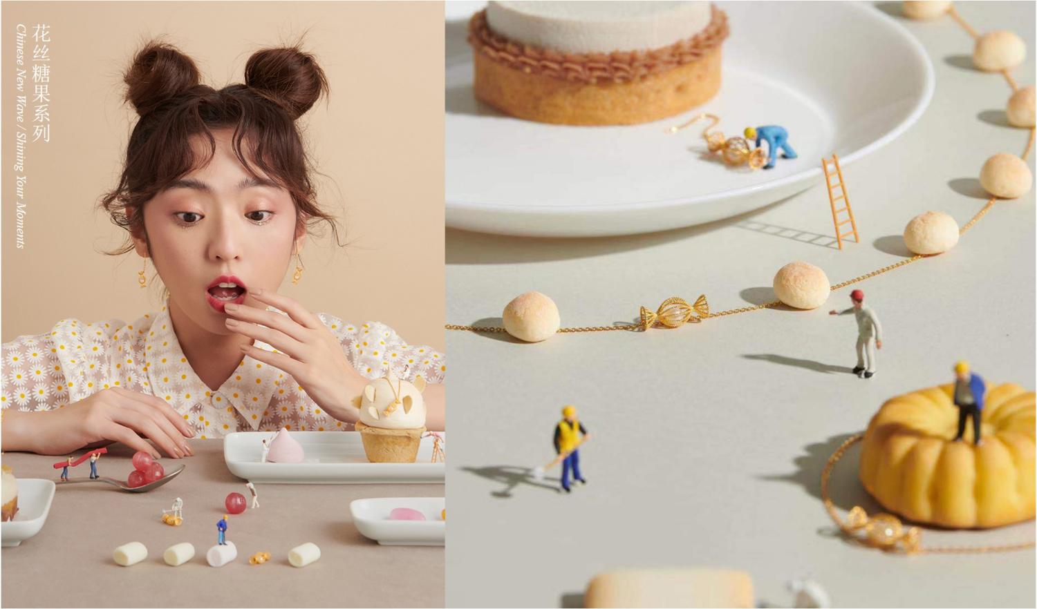 数位国际设计师,从中国传统文化中寻找设计灵感,用非遗花丝呈现创意奇思,不断拓宽非遗工艺的创作边界。先锋创新,验证了工艺的包容性,潮宏基利用品牌优势将创新工艺进一步转译为珠宝设计语言,让非遗链接市场需求:2019年,“驻地计划”设计师、日本设计天才佐藤大,以非遗工艺创新为依托点,将传统花丝镶嵌与甜美可爱的糖果造型结合,演绎“花丝糖果”系列。2023年,潮宏基携手驻地设计师明硕,推出“花丝云起”系列,演绎“闲看云起”的松弛感,用创新设计赋予非遗新的生命力。基于对市场的洞察,潮宏基非遗花丝首饰设计屡获认可,成功让非遗花丝实现商业化。