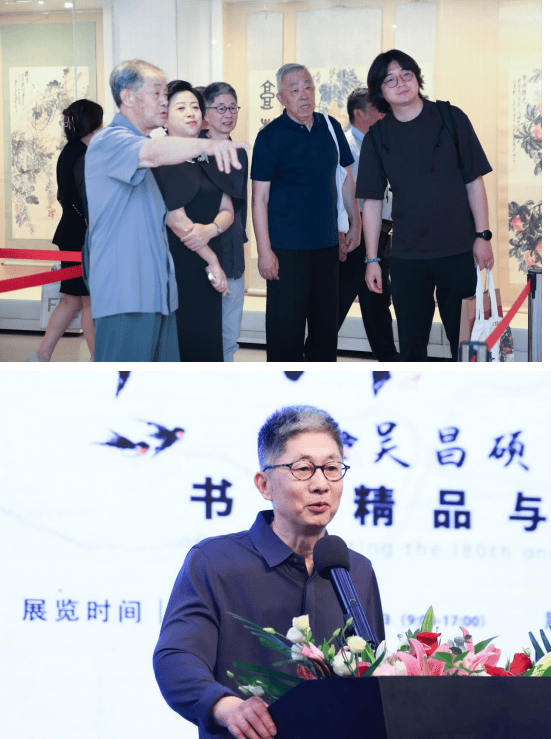 吴昌硕为“清末海派四大家”之一, 集“诗、书、画、印”为一 身, 融金石书画为一炉, 被誉为“石鼓篆书第一人”、“文人画最后的高峰”。在绘画、书法、篆刻上都是旗帜性人物, 在诗文、金石等 方面均有很高的造诣。此次展览虽然作品只有 100 余幅,但却很精, 很具代表性。从题材上讲, 既有花卉, 也有山水、人物、还有砚拓铭文; 从材质上讲, 既有纸本的, 也有泥金绢本的, 还有绫本的;从创作 主体上讲, 既有独立完成的, 也有合作完成的;从来源上讲, 既有私人 珍藏的, 也有机构收藏的, 可谓是展览虽小, 内涵却大, 场地虽简, 品味却高。“千年桃实大如斗”, 吴昌硕是属于中国的, 也是属于世 界的, 更是属于人类共同精神家园 的 …… “丹光碧叶寿万春”, 吴昌 硕是属于昨天的, 也是属于今天的,更是属于明天的 ......“年年看花 (画)人,颜色如花(画)好”,这是吴昌硕的诗,也是吴昌硕对我们今天的“看花 (画)人”的真诚祝福。