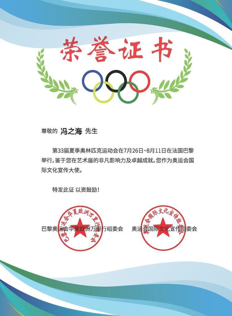 2024 巴黎奥运将吸引全球 40 亿双目光成为全球重大传播中心,盛大开幕式将吸引世界各国政要、体育明星、商界大鳄、各国媒体等,齐聚巴黎。2024 法国巴黎这个艺术与体育交融成辉的国际艺术之都将吸引全球的亿万目光,它也将成为 全球的焦点,更将成为世界艺术关注的中心。著名书法家冯之海被评为法国巴黎奥运会国际文化宣传大使!