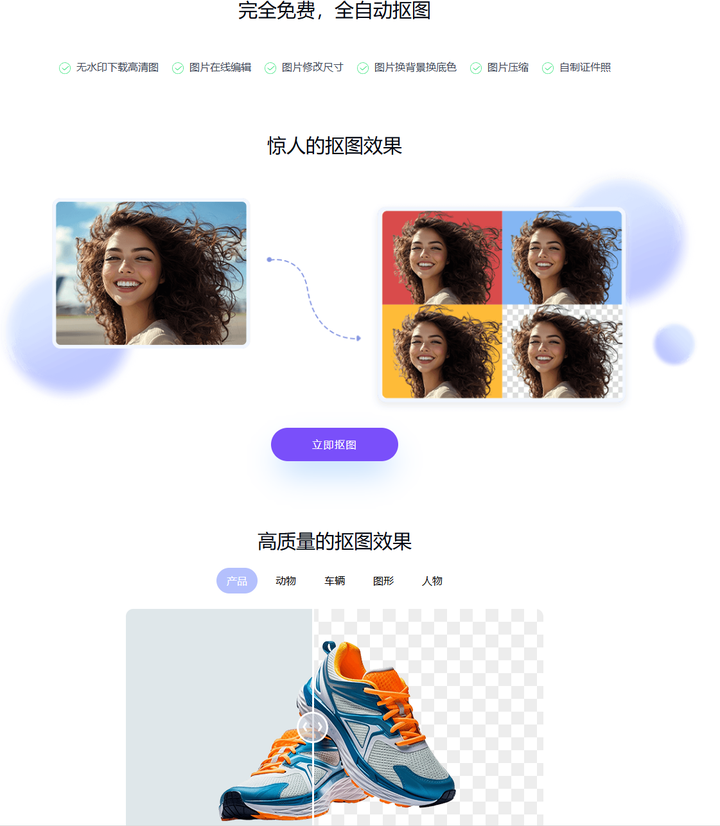 就是这款,全自动免费还能批量抠图的网站,即使你没有任何抠图经验也能轻松上手,这款工具能支持上传多种图片格式,还能抠各种你用PS很难解决的图像,比如动物、电商产品图、车辆、各种图形、人物、动漫等等。下面我们一起来看下这款工具的抠图表现力如何。