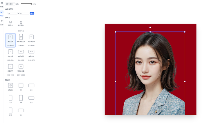 修改尺寸:尺寸可自由选择,网站已经提供了各种尺寸,比如电商、自媒体、证件照、手机、淘宝主图等等。