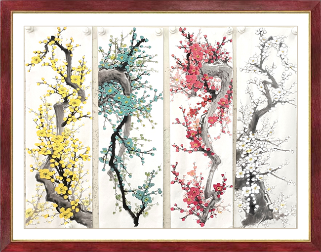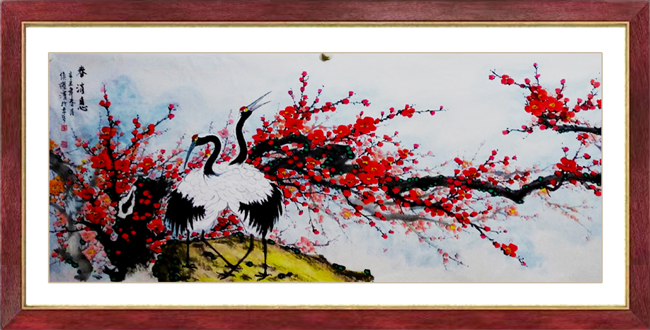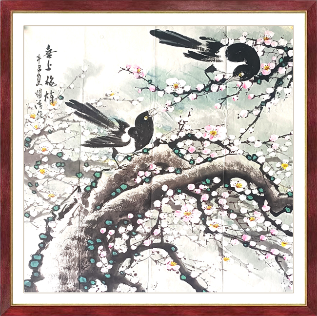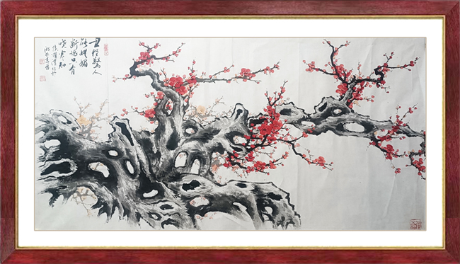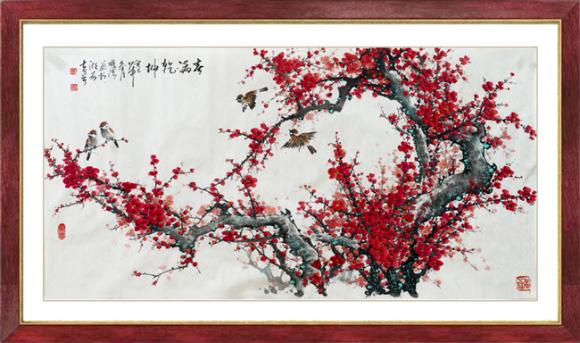 耀清是一位修养、人品、悟性较高的艺术家,艺术精诚,人品真诚,为人厚道。“万壑千山香染遍,梅花风骨雪精神”,这就是他追求的风骨精神。其所作之“梅”如冰如玉,直立横斜的穿插,枝干似铁交错雄健,彼此相生而相应,淡淡相间而相成,一派清气四溢,一种骨气铮铮。耀清画梅深受王成喜先生影响,讲究梅花的构图布局,可见匠心独具,为求以少胜多,很注重空间的处理,使无画处皆成妙境,即不杂乱,凋疏,又使整体氛围、洋溢着对生活的热爱。