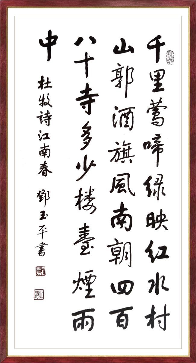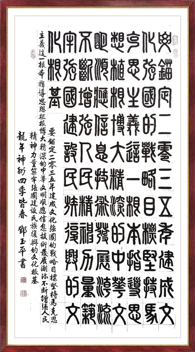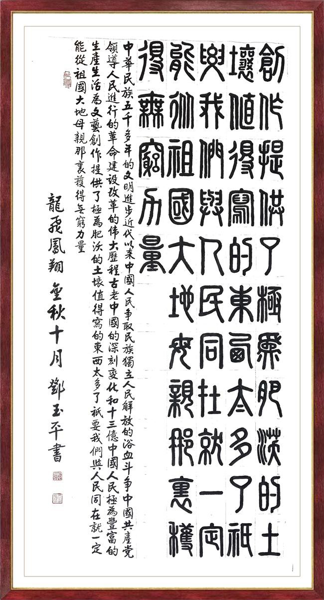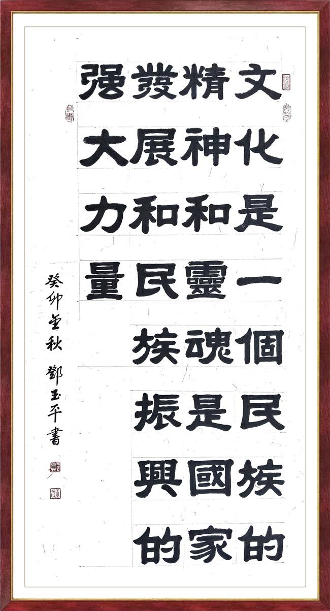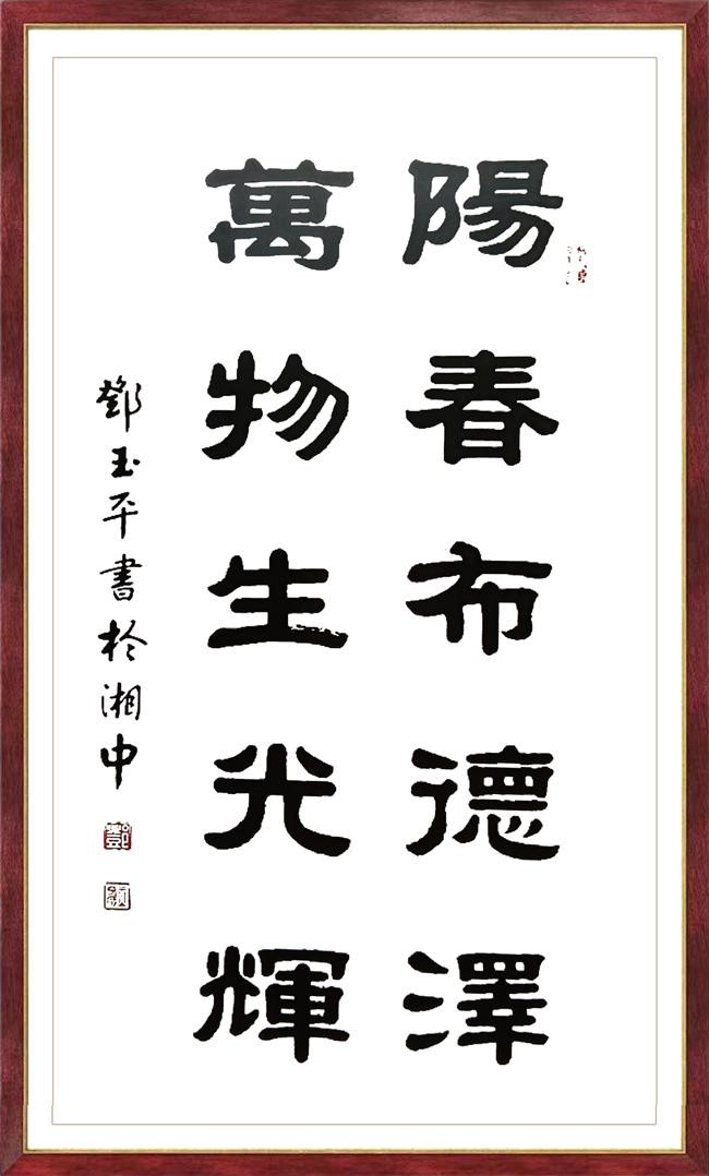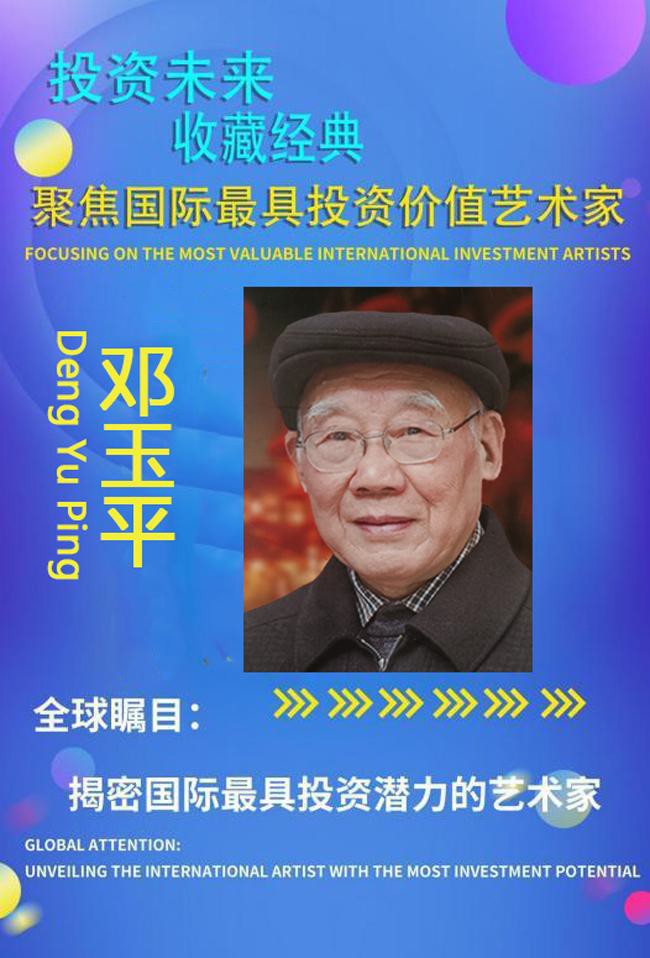 邓玉平,中共党员,1937 年出生于湖南双峰书香门第。9 岁开始临帖,父辈的严格要求,家庭文化环境的熏陶,使他对祖国传统文化有了浓厚兴趣和执着追求。多年来获奖无数。《中华瑰宝》编委会和中书研相关领导题写的长篇评论《洞庭风骨湘水才情——艺坛巨匠邓玉平》和史峰先生的专评《尚古求法琢秦汉,法度严谨书真法——记著名书法家邓玉平》全面深刻,很有代表性。2019 年庆祝新中国成立 70 周年,世界华人楷模协会评定袁隆平,郎平,邓玉平,任正非,叶嘉莹,丘成桐六位为华人楷模,颁发荣誉证书,编印《华人楷模·引领世界》专集。中意建交五十周年组委会特授予杨振宁、柳传志、邓玉平、袁隆平为形象大使(中方)。2020 年,他的作品入编《献礼故宫建成六百周年当代书法十大名人特刊》,组委会授予他“中国文化·百年巨匠”荣誉称号。