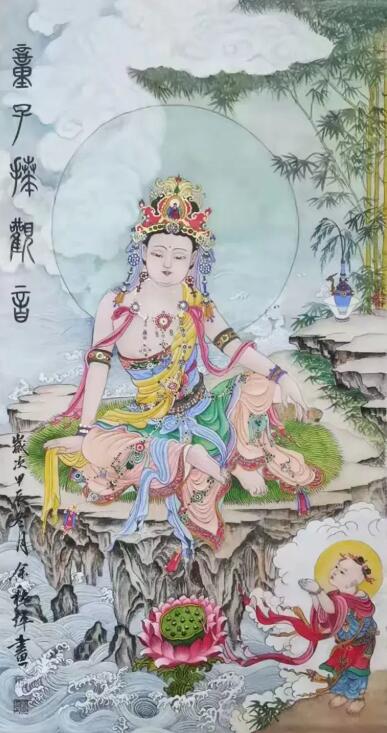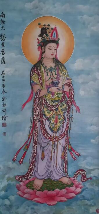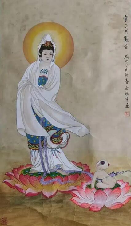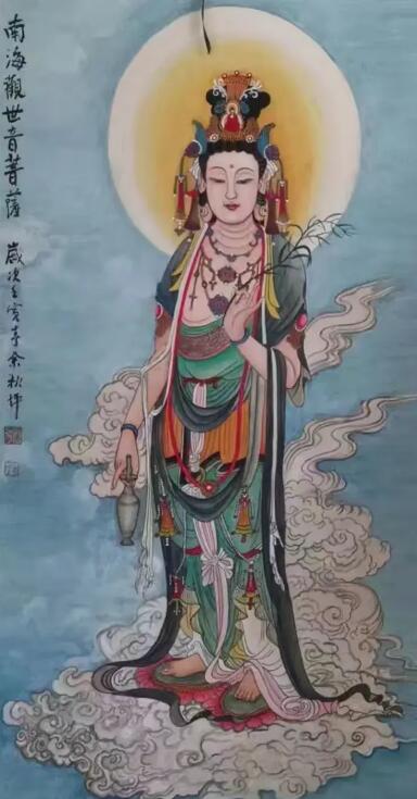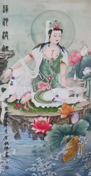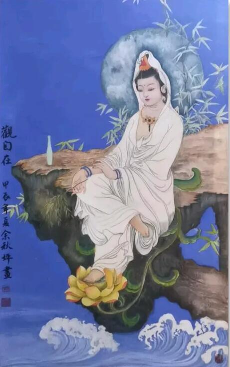 实力派画家余秋坪女士工笔人物画观音像《观音菩萨》图中观音大士笔墨刻画细腻,线条精致,画中的观音面露微笑,刻画出观者的庄严慈悲形象,韵味十足,有呼之欲出之效果,无尽震撼与崇敬令观者油然而生。作者将情感和笔墨相融合,观音上半身像神态自如,仪态端庄,心态怡然。观音形象在画家笔下生动形象地表现出来。而且观音寓意着平安、幸福,远离灾祸,有着美好、吉祥的寓意。是收藏悬挂的佳品,适合挂在茶室、财位、书房等地。