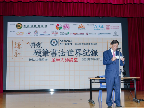 当日下午2时,伴随着现场师生的期待,活动正式拉开帷幕。香港特别行政区政府油尖旺民政事务专员余健强先生致词,他高度肯定本次活动对弘扬中华文化、推广书法艺术的重要意义,强调书法不仅是文字的艺术,更是文化传承的载体,鼓励学生们珍惜机会,在笔墨间感受传统文化的魅力。随后,香港宋庆龄基金创会会长、港区全国人大代表胡晓明教授表示这次透过创新世界纪录,香港青少年有机会为香港发放更多正能量,并在国际社会推广中华文化,让世界认识及了解中国。他并表达对进一步弘扬中华文化、促进青少年全面发展的殷切期望。