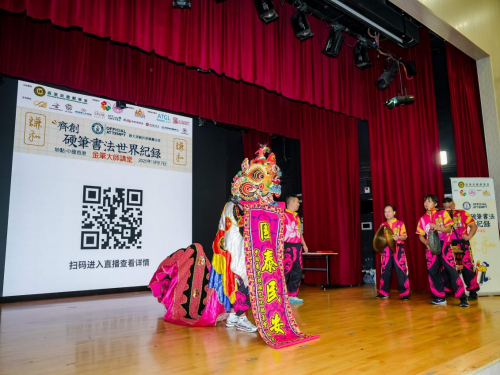 活动尾声,香港客家人文化协会带来精彩的舞麒麟表演,威武灵动的麒麟伴随着铿锵的鼓点腾跃翻转,将现场气氛推向高潮。传统民俗艺术与书法文化在此刻交融,既为本次创纪录活动画上圆满句号,也让在场师生深切感受到中华文化的多元魅力与蓬勃生命力。