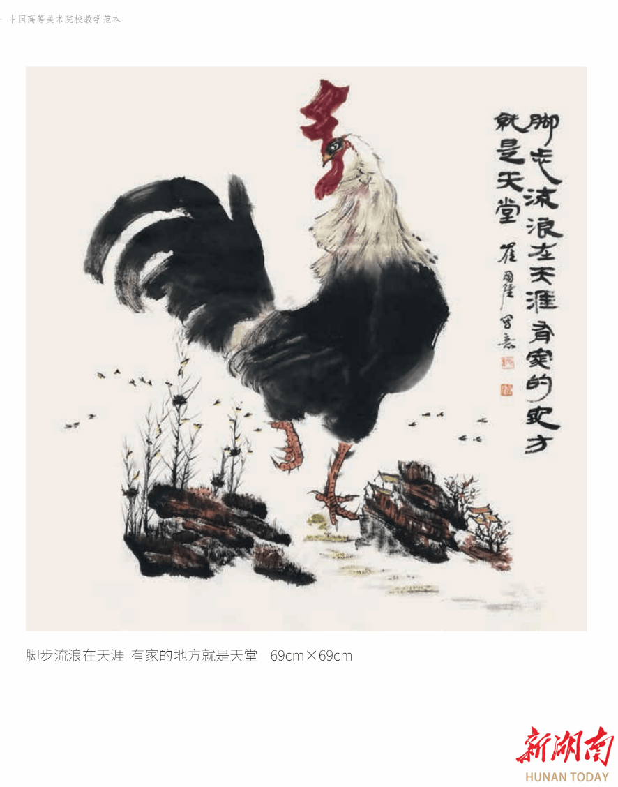 国强之画,非止于翎毛写生之态,更在于以鸡喻人、借物言志的深意。鸡之为物,自古承载丰富意涵。《韩诗外传》誉其具“文、武、勇、仁、信”五德,俨然儒家理想人格的化身。国强慧眼独具,于此寻常家禽身上,洞见了一个浓缩的“人”间剧场。画册中那些或昂首阔步、睥睨群雄的雄鸡,或温情脉脉、守护雏儿的母鸡,或懵懂稚拙、探索世界的小鸡,何尝不是尘世中我们自身的万千投影?