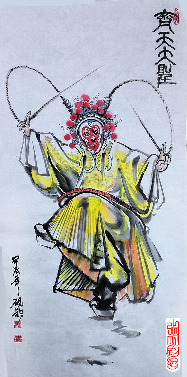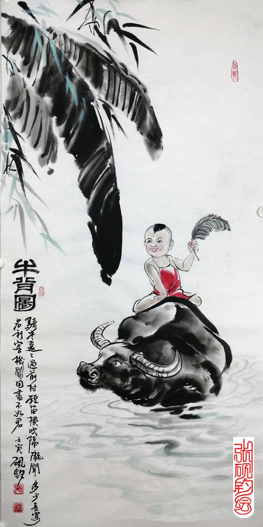 以中传统的水墨画工具笔墨纸砚,创作的却是风趣幽默的漫画造型,又是张砚钧先生的另一种绘画特色,即水墨漫画。传统中渗透着了新意,老道厚重的笔墨中又不失活泼和轻松!既有酣畅淋漓的泼墨染色,又有娓婉细腻的线条勾勒。刚柔并济,线面组合,墨色交融,骨肉俱全,很有韵律感与节奏感,给人以自然、率真的艺术享受。