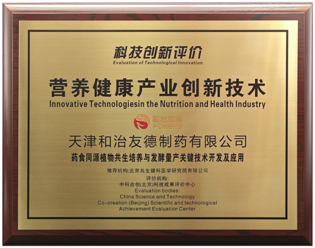 近日,天津和治友德制药有限公司《药食同源植物共生培养与发酵量产关键技术开发及应用》项目,成功通过营养健康产业创新技术科技创新评价,获取了中科合创(北京)科技成果评价中心颁发的《营养健康产业创新技术》奖牌、证书和评价报告,和治友德科技创新能力再次获得权威认可。