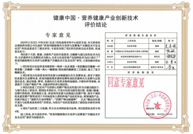 天津和治友德制药有限公司的“药食同源植物共生培养与发酵量产关键技术开发及应用”科技成果,经专家评定认为,该项目基于天然、健康、功能性产品的市场需求,以酶解与蛋白改性技术为先导,以多菌种共生发酵技术为核心,以多元化高价值产品创制技术为出口,在工艺流程、复合酶解技术、多菌种共生发酵以及提升目标产物的产率、功能多样性和生物活性等方面实现技术创新,并实践验证了“菌群共生协同增效”、“发酵产物功能缓释” 以及“酶法改性提升蛋白与淀粉基质相容性”等理论。经专家组评审,“药食同源植物共生培养与发酵量产关键技术开发及应用”被评为创新技术。
